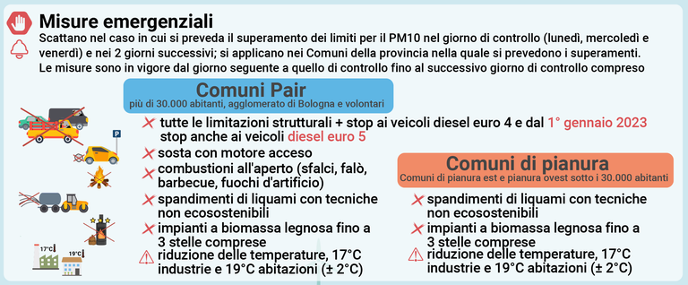 Da sabato 1° ottobre 2022 fino al 30 aprile 2023 sono in vigore le misure previste dal Piano Aria Integrato Regionale (PAIR) con l'obiettivo di ridurre le emissioni degli inquinanti più critici (pm10, biossido di azoto). Le misure riguardano tutti i Comuni di pianura.