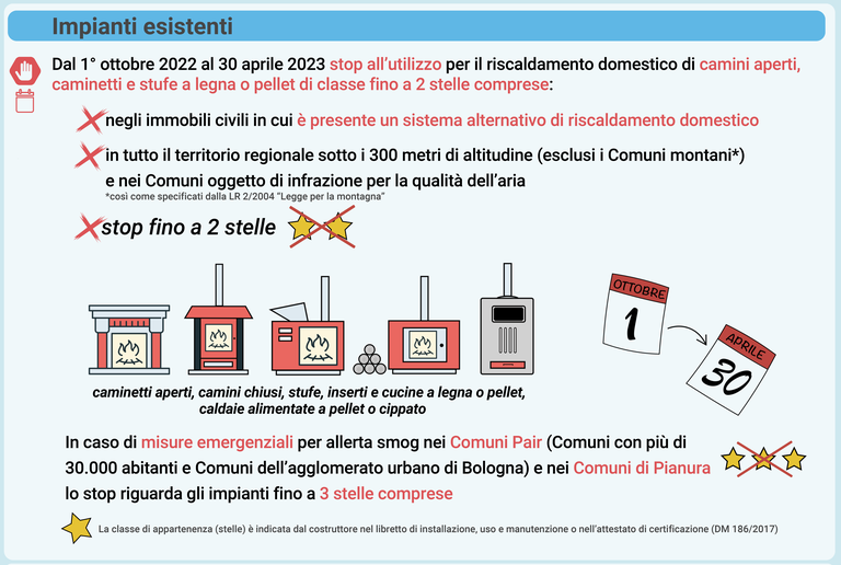 • Misure emergenziali (clicca per il dettaglio)Oltre alle limitazioni alla circolazione dei veicoli più inquinanti, viene confermato tra le misure strutturali il divieto di utilizzo, in presenza di riscaldamento alternativo e sempre dal 1° ottobre al 30 aprile, degli impianti di riscaldamento a biomassa inferiori alle 3 stelle e dei camini aperti nei Comuni situati sotto i 300 metri di altitudine.