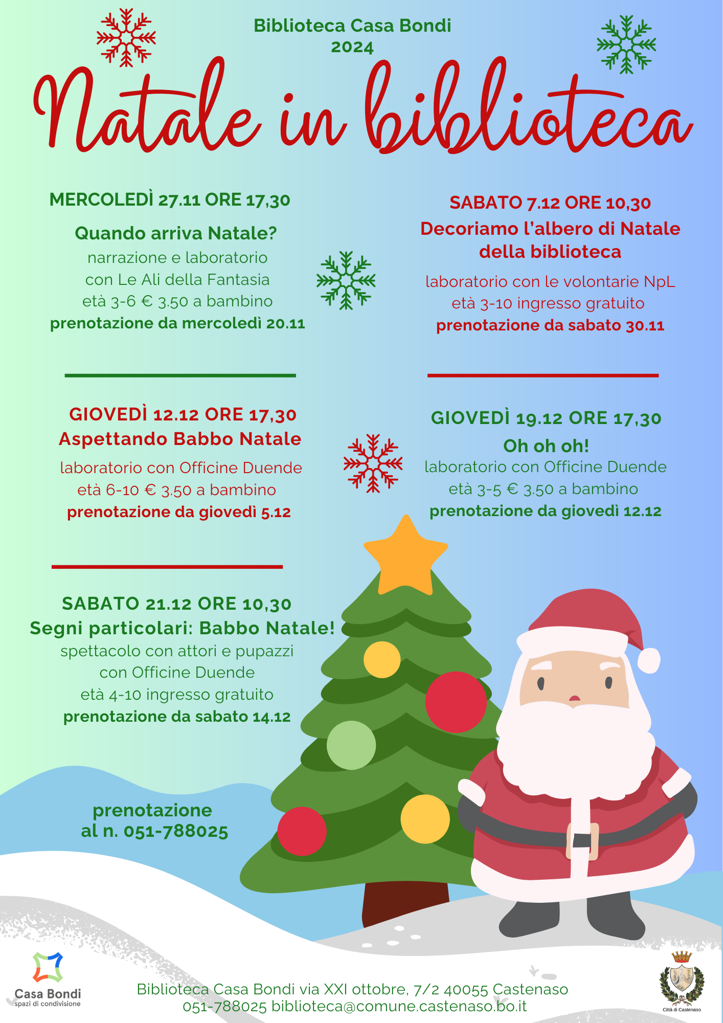 Laboratori e spettacoli per bambini a Casa Bondi e al Muv; presepe vivente, arti circensi, mercatini, musica e animazione, punti ristoro nelle “Piazze del Natale” a cura di Proloco Castenaso, Com Com, La Stalla, Legiones in Agro Boiorum ed altre associazioni del territorio; musica e balli al Centro Sociale L’Airone; “Quattro cori e una capanna” il concerto di Natale a gran voce organizzato dalla zona Pastorale di Castenaso. Per chiudere l’anno in bellezza con il tradizionale rogo della vecchia in Piazza, che lascerà la scena alla Befana, in arrivo il 5 gennaio al MUV.