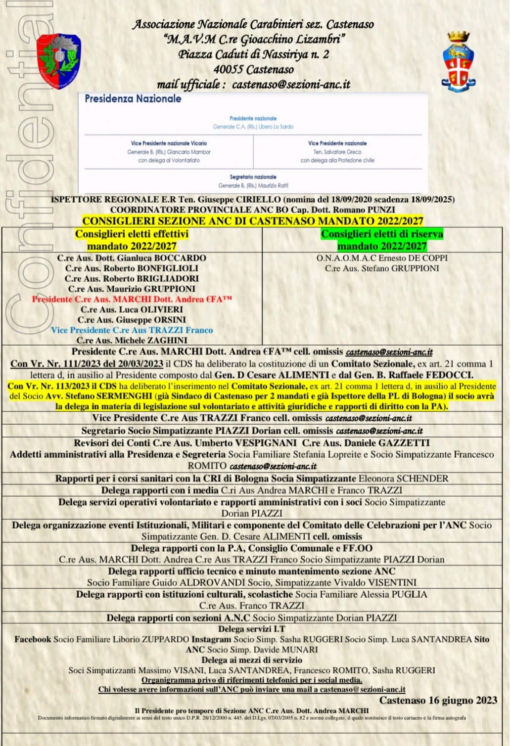 | Organigramma | Presidente: C.re Aus. Dott. Andrea Marchi (348.2849029) Vice Presidente: C.re Aus. Franco Trazzi (347.1262936) Segretario di sezione: Socio simpatizzante Dorian Piazzi con delega servizi operativi volontariato e rapporti con i soci (335.7872867) Delegato Eventi e Cerimonie Istituzionali Gen. D. Cesare Alimenti |