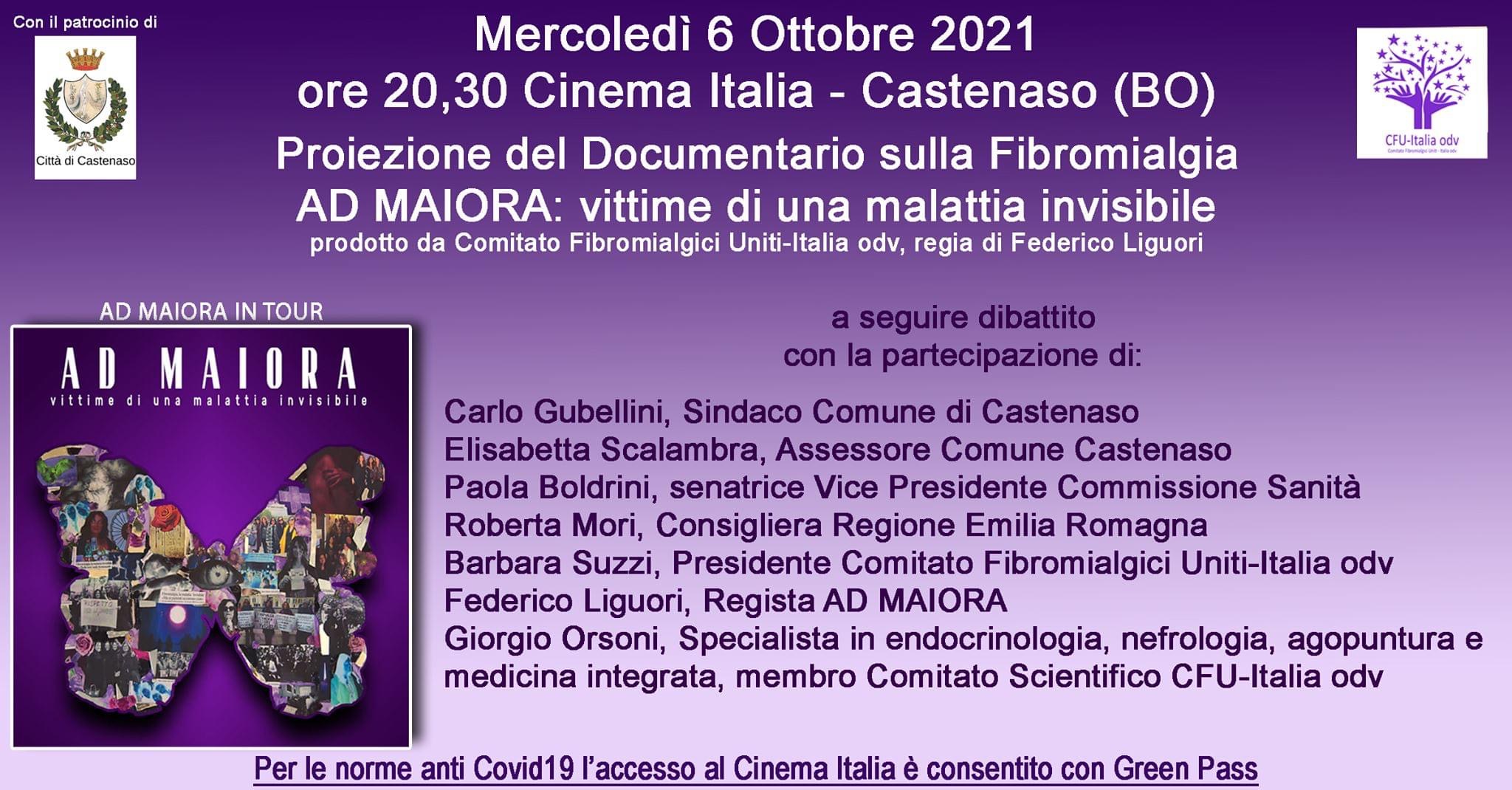La fibromialgia è una malattia non ancora riconosciuta dallo Stato, che colpisce circa 3 milioni di italiani. Mercoledì 6 ottobre 2021, a partire dalle ore 20.30 al Cinema Italia si affronterà questo tema, attraverso la proiezione del docu-film “Ad Maiora - Vittime di una malattia invisibile”, prodotto dal Comitato Fibromialgici Uniti-Italia ODV, con la regia di Federico Liguori.