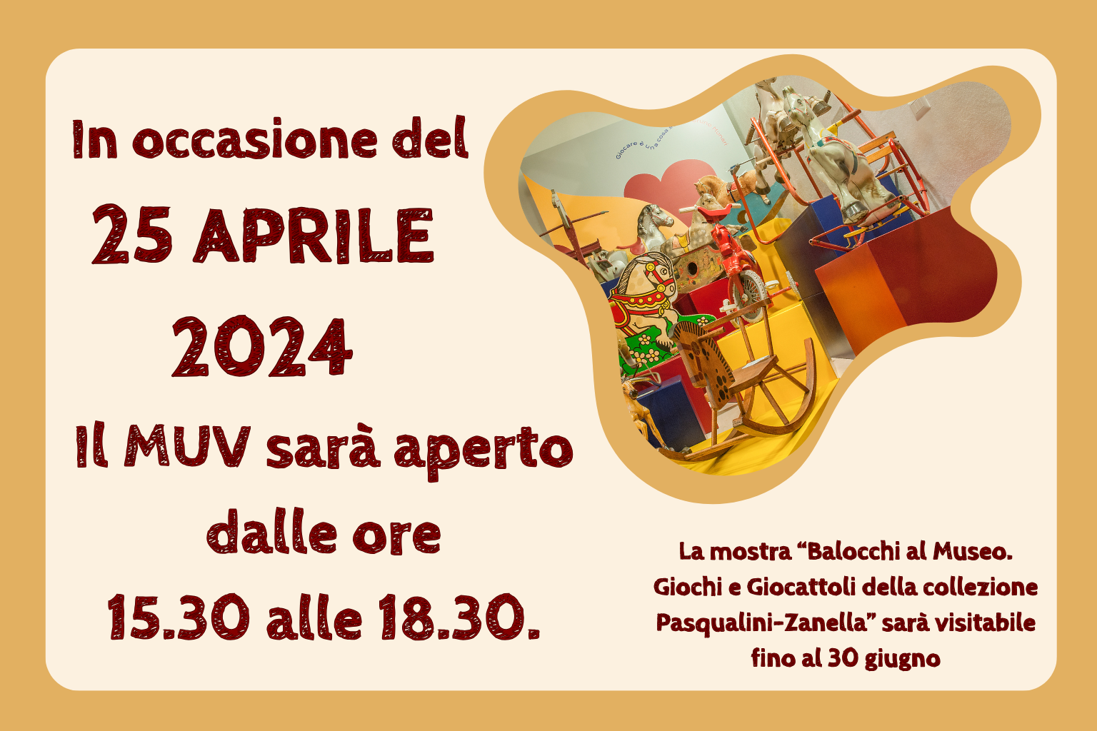 In occasione della Festa della Liberazione, giovedì 25 aprile 2024 il MUV rispetterà l'orario di apertura