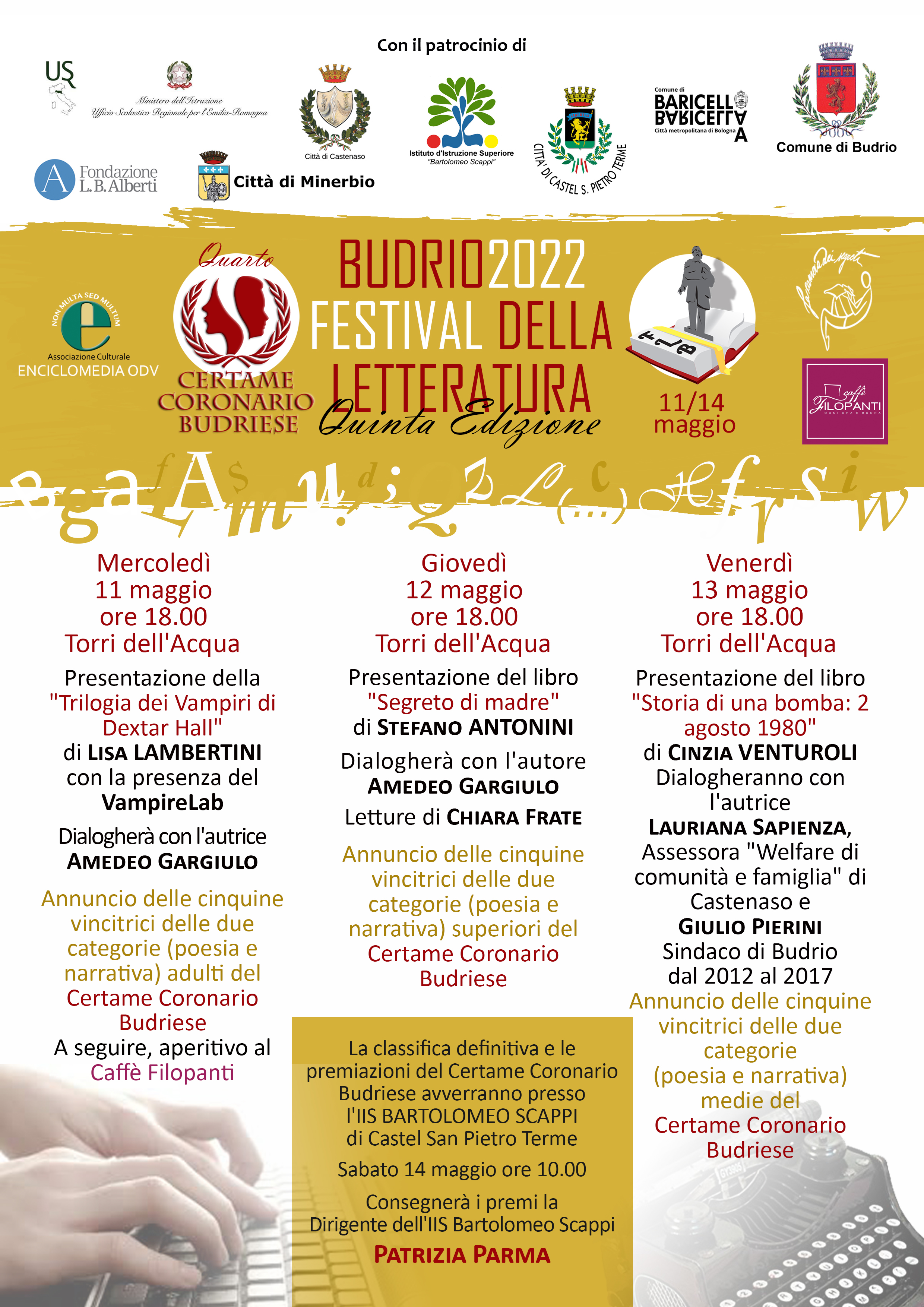 Da mercoledì 11 maggio a venerdì 13, a Budrio (Torri dell'Acqua), la V edizione del Festival della letteratura, nonchè la IV edizione del Certame Coronario Budriese. Con il patrocinio del Comune di Castenaso.