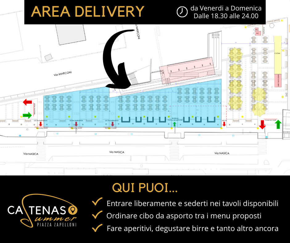 Un nuovo spirito che guarda al futuro e non si ferma all'evento di questa estate. Uno spirito di collaborazione e voglia di fare dei giovani imprenditori della ristorazione presenti sul territorio che ci ha dato la possibilità di sviluppare l'idea iniziale e costruire in brevissimo tempo questo nuovo format che è descrivibile, in estrema sintesi, come un ampia area dehors suddivisa in diverse zone dove sarà possibile cenare con i menù offerti nelle serate a tema o richiedere la consegna sul posto da qualsiasi altra attività aderente, bere un cocktail o una birra e fare colazione al fresco il sabato e la domenica mattina.