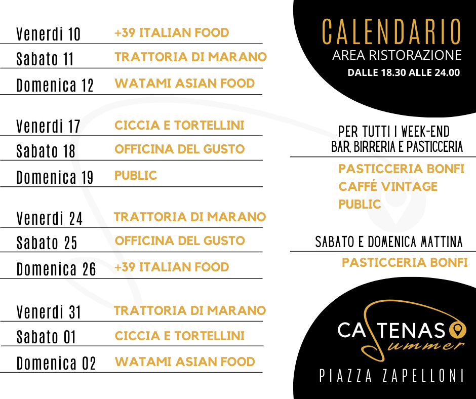 Castenaso Summer è “un evento” che si svolgerà tutti i fine settimana a partire dal 10 luglio al 2 agosto in piazza Zapelloni dalle 18:30 alle 00:00 e il sabato e la domenica mattina dalle ore 7:30 alle 12:00.