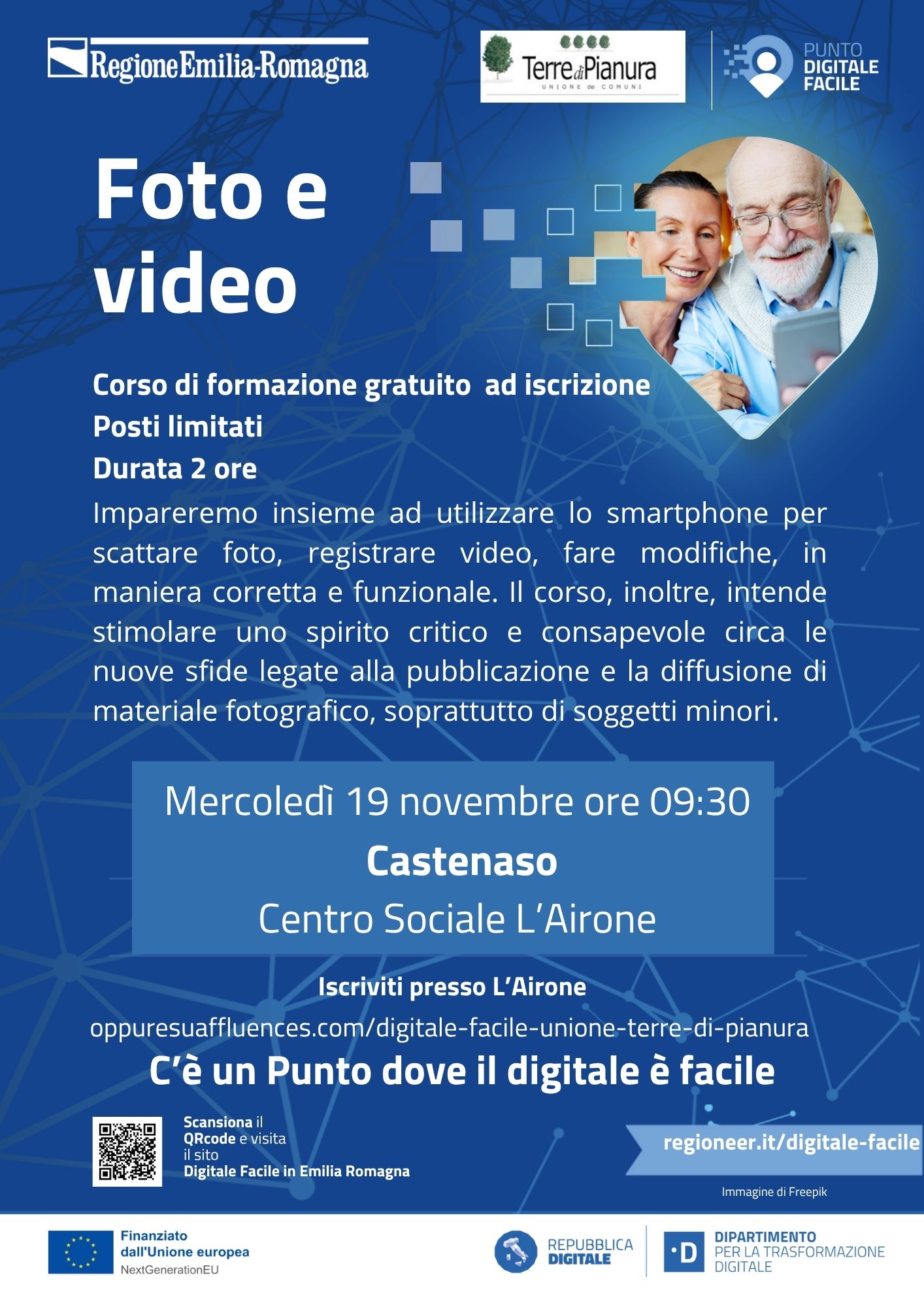 Mercoledì 19 novembre alle ore 9.30, presso il Centro Sociale “L’Airone” di Castenaso, si terrà il corso gratuito “Foto e video”, promosso dalla Regione Emilia-Romagna e dall’Unione Terre di Pianura nell’ambito del progetto Punto Digitale Facile.