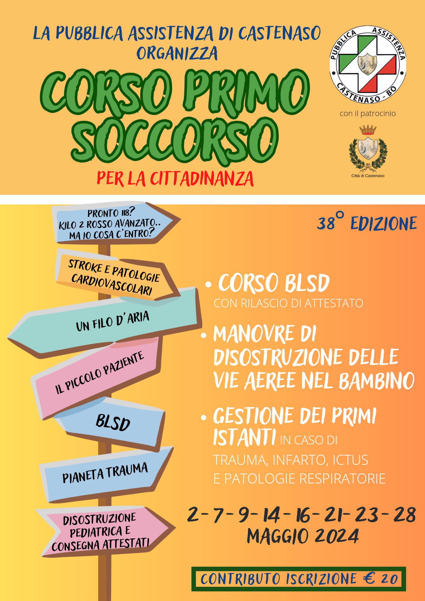 La Pubblica Assistenza di Castenaso organizza la 38^ edizione del Corso di primo soccorso per la cittadinanza tutti i martedì e giovedì di maggio ( 2-7-9-14-16-21-23-28 ) dalle 20.30