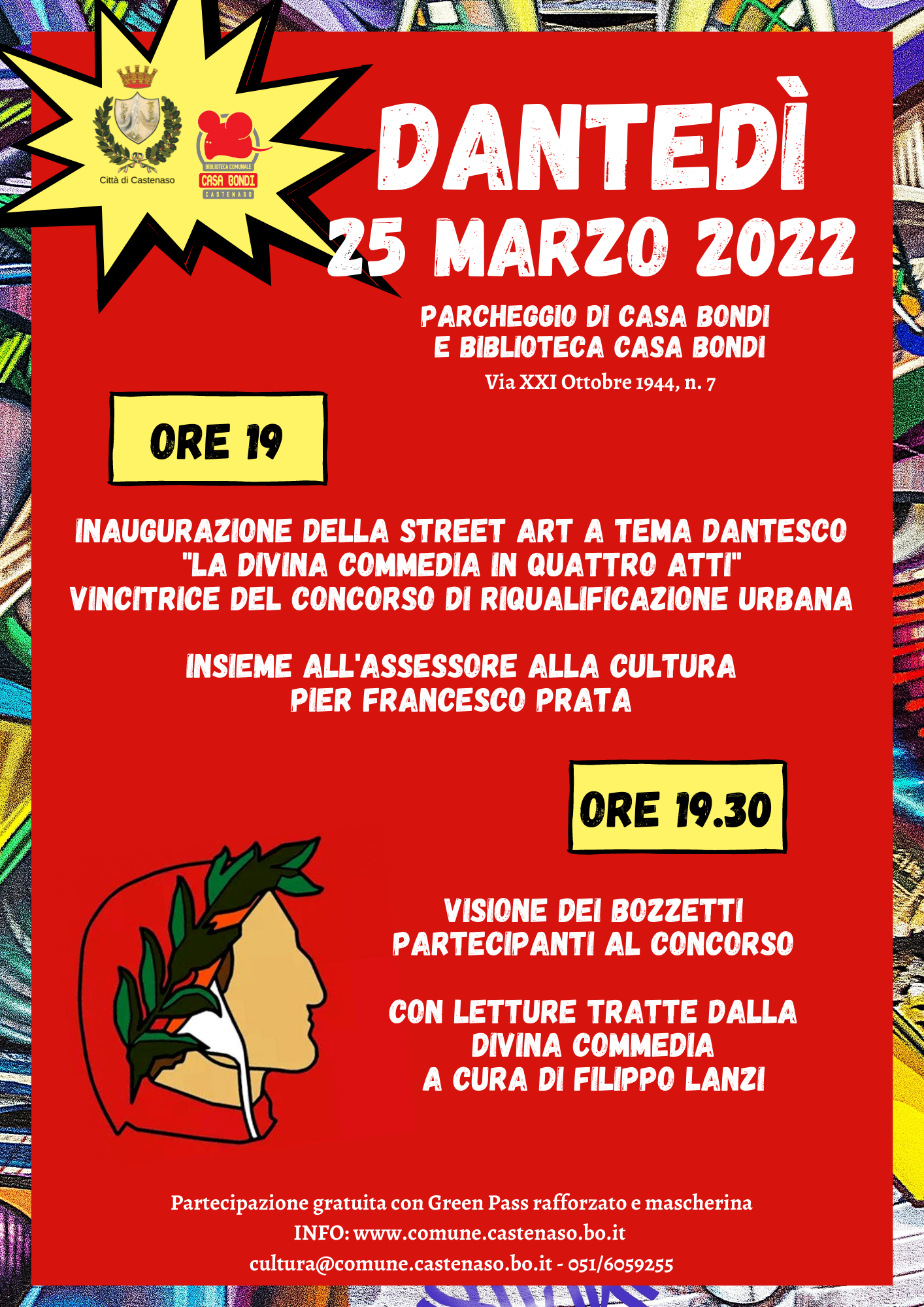 A partire dalle ore 19 a Casa Bondi Ragazzi per la presentazione alla cittadinanza dei 32 bozzetti, estremamente creativi e di qualità, ricevuti durante il bando di concorso pubblicato la scorsa estate e a seguire, nel parcheggio di Casa Bondi, l’Assessore alla Cultura, Pier Francesco Prata, inaugurerà il nuovo murales con una performance dantesca a sorpresa dell’attore Filippo Lanzi.