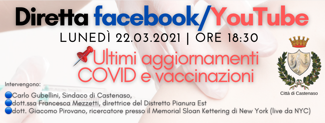 Lunedì 22 marzo 2021, alle 18:30, diretta streaming Facebook e YouTube per gli ultimi aggiornamenti sull'epidemia da COVID-19 e informazioni sulle vaccinazioni.