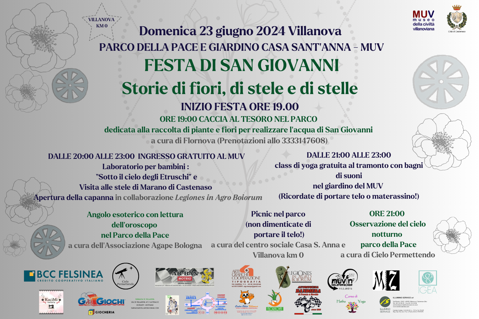 L'evento, realizzato dall'associazione Villanova Km0 in collaborazione con il MUV - Museo della civiltà Villanoviana, avrà inizio alle ore 19:00 con la caccia al tesoro nel parco organizzata da Flornova: per raccogliere piante e fiori per realizzare l'acqua di San Giovanni (prenotazioni allo 3333147608).