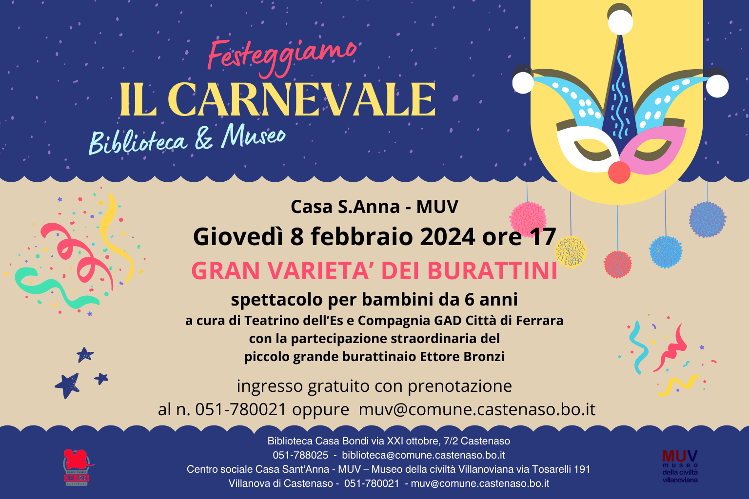 Il MUV, in collaborazione con Casa Sant’Anna, quest’anno per il carnevale ospita lo spettacolo a cura di Vittorio Zanella e Rita Pasqualini del Teatrino dell’Es e a cura della Compagnia GAD Città di Ferrara, con una performance straordinaria del giovanissimo burattinaio Ettore Bronzi.