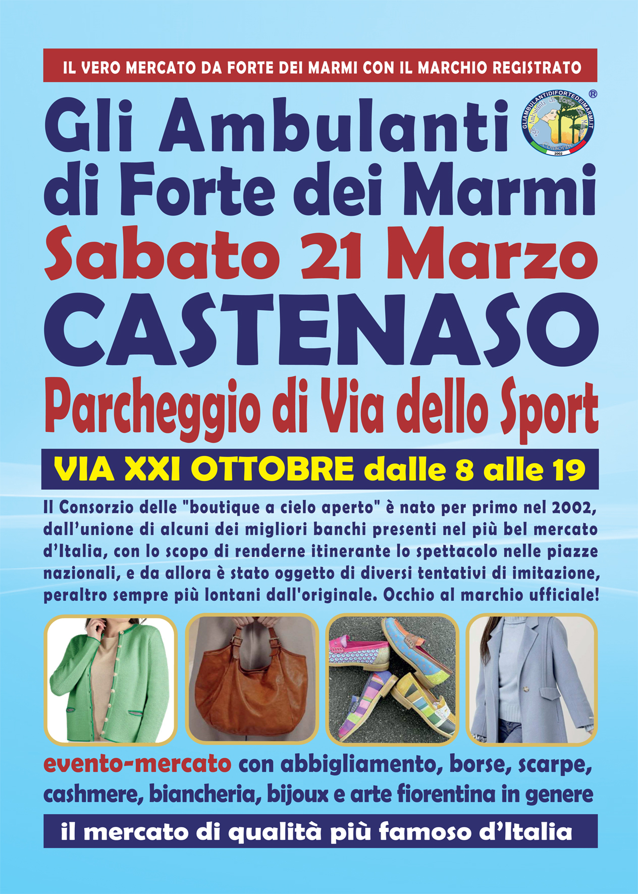 Sabato 21 marzo Castenaso ospita uno degli appuntamenti più attesi dello shopping itinerante: Gli Ambulanti di Forte dei Marmi, il mercato di qualità più famoso d’Italia. Per l’intera giornata, dalle 8:00 alle 19:00, via XXI Ottobre (Parcheggio di Via dello Sport) si trasformerà in una grande “boutique a cielo aperto” dove stile, tradizione e convenienza si incontrano.