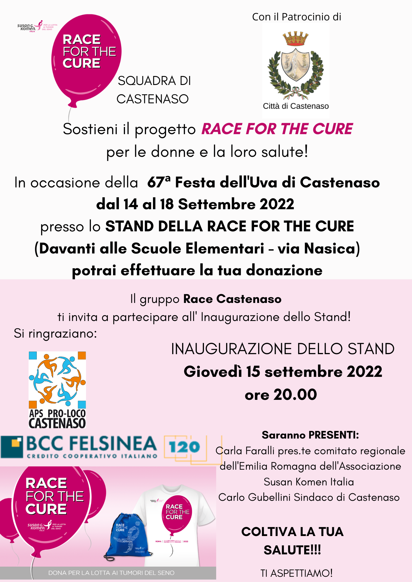 In occasione della 67^ Festa dell’Uva di Castenaso 14- 15- 16 – 17- 18 settembre 2022 presso lo stand della Race for the cure – potrai anche tu effettuare la tua donazione!