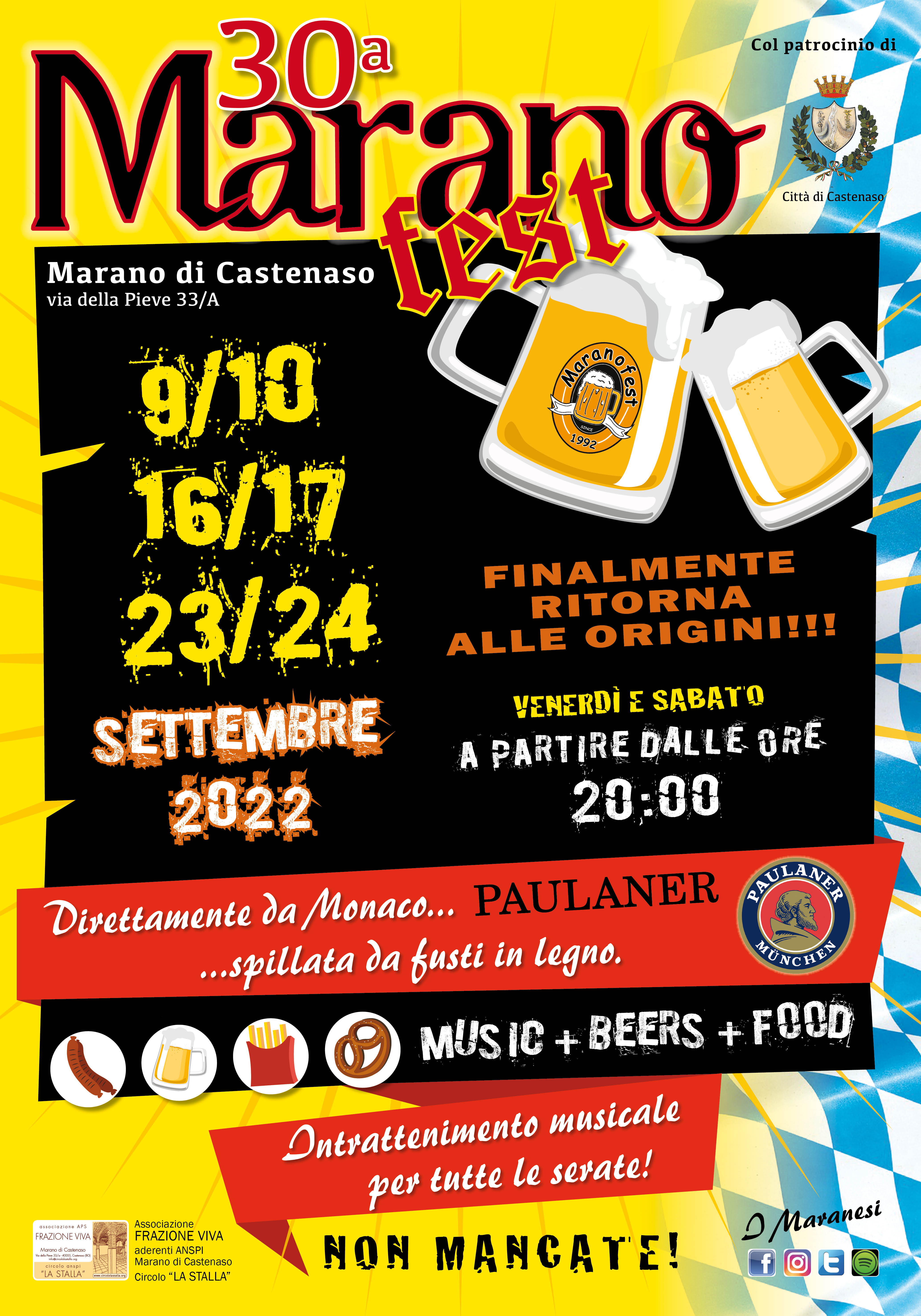 Dal 9 settembre il gruppo de 'I Maranesi' aspetta tutti con la 30esima edizione della Marano Fest a Marano di Castenaso (via della Pieve 33/A), col ritorno alle modaità originali, che l'hanno resa celebre per tre decenni.