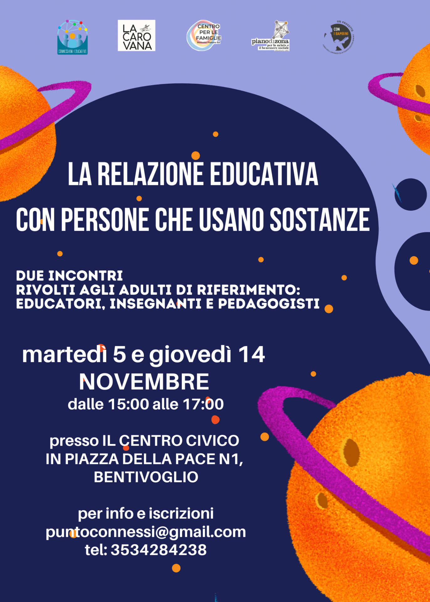 Il 5 e 14 novembre dalle 15.00 alle 17.00 si terranno due incontri rivolti agli adulti di riferimento: insegnanti, educatori, genitori organizzati all'interno del progetto Connessioni Educative Educative finanziato dalla Fondazione con i Bambini sul tema del rapporto educativo con giovani che usano sostanze.
