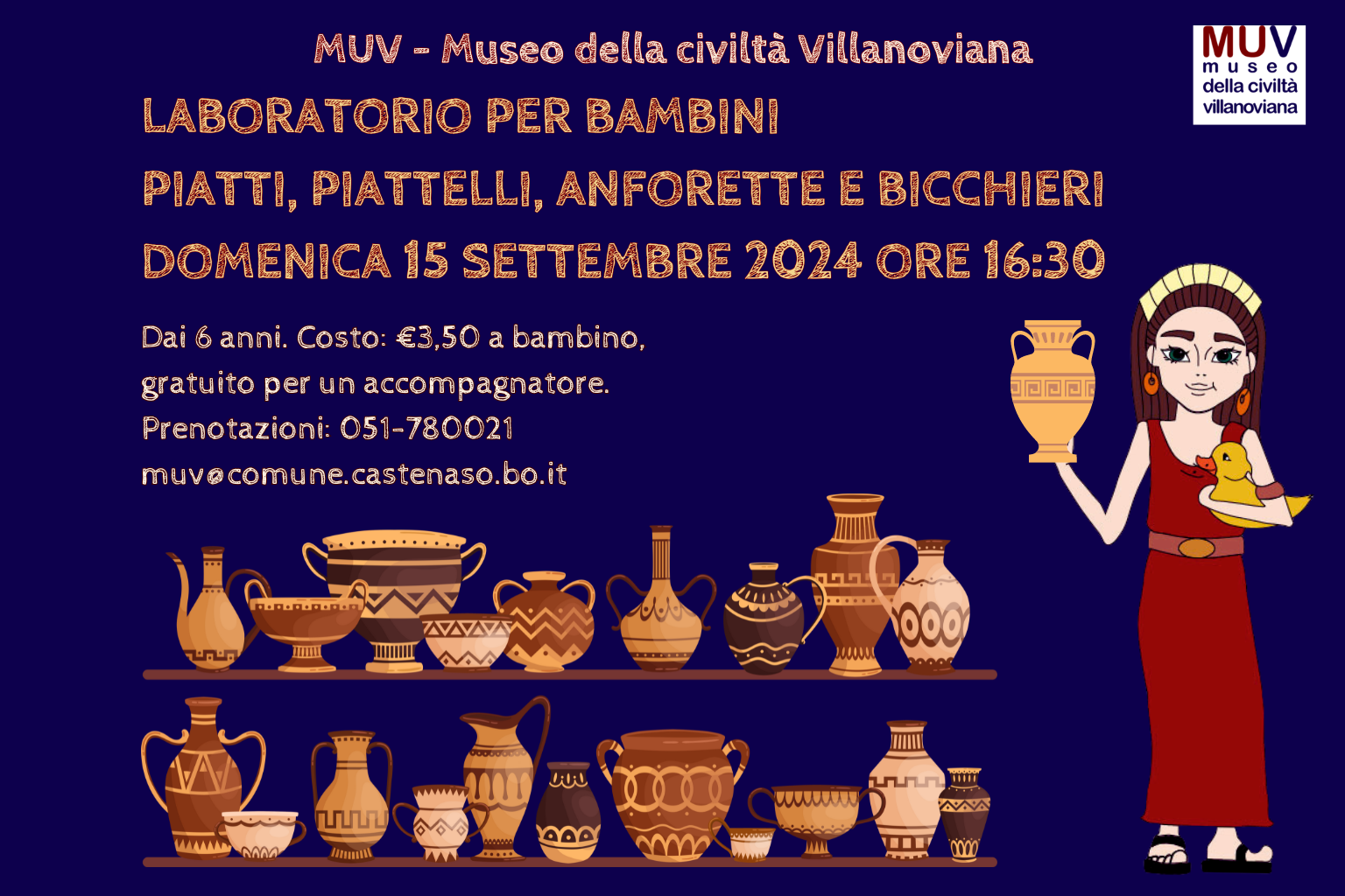 Ricominciano i laboratori al MUV! Velia, la nostra giovane villanoviana, è pronta a condurvi in nuove ed entusiasmanti avventure! Domenica 15 settembre vi aspettiamo per un laboratorio nei panni di antichi vasai. Metteremo le mani nell’argilla e realizzeremo vasi in ceramica in stile villanoviano. Alle 16.30, dopo una la visita guidata tra i corredi della necropoli di Marano di Castenaso, i bimbi realizzeranno vasi riccamente decorati che