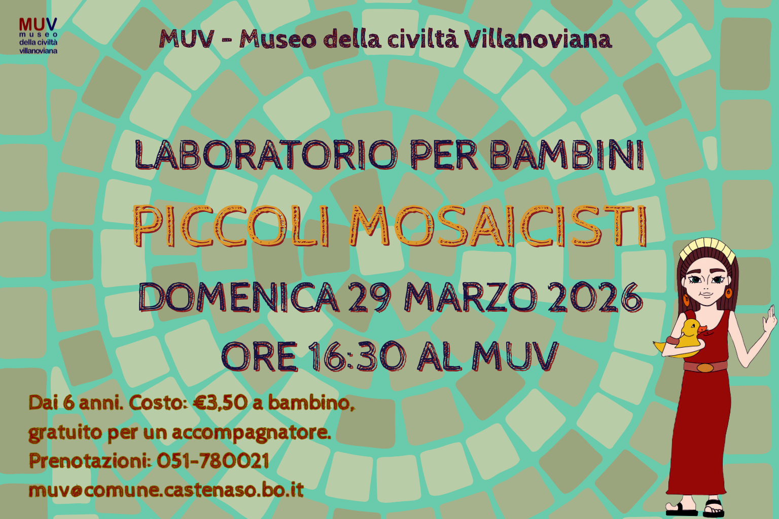 Domenica 29 marzo, al MUV vivremo l’ultimo appuntamento del mese dedico all’epoca romana sul nostro territorio. I bambini realizzeranno i loro personalissimi e fantasiosi mosaici multicolore. Durante il laboratorio, i giovani partecipanti si impegneranno nell’assemblare tessere di storia per poi portare a casa il loro piccolo tappeto di pietra!!!