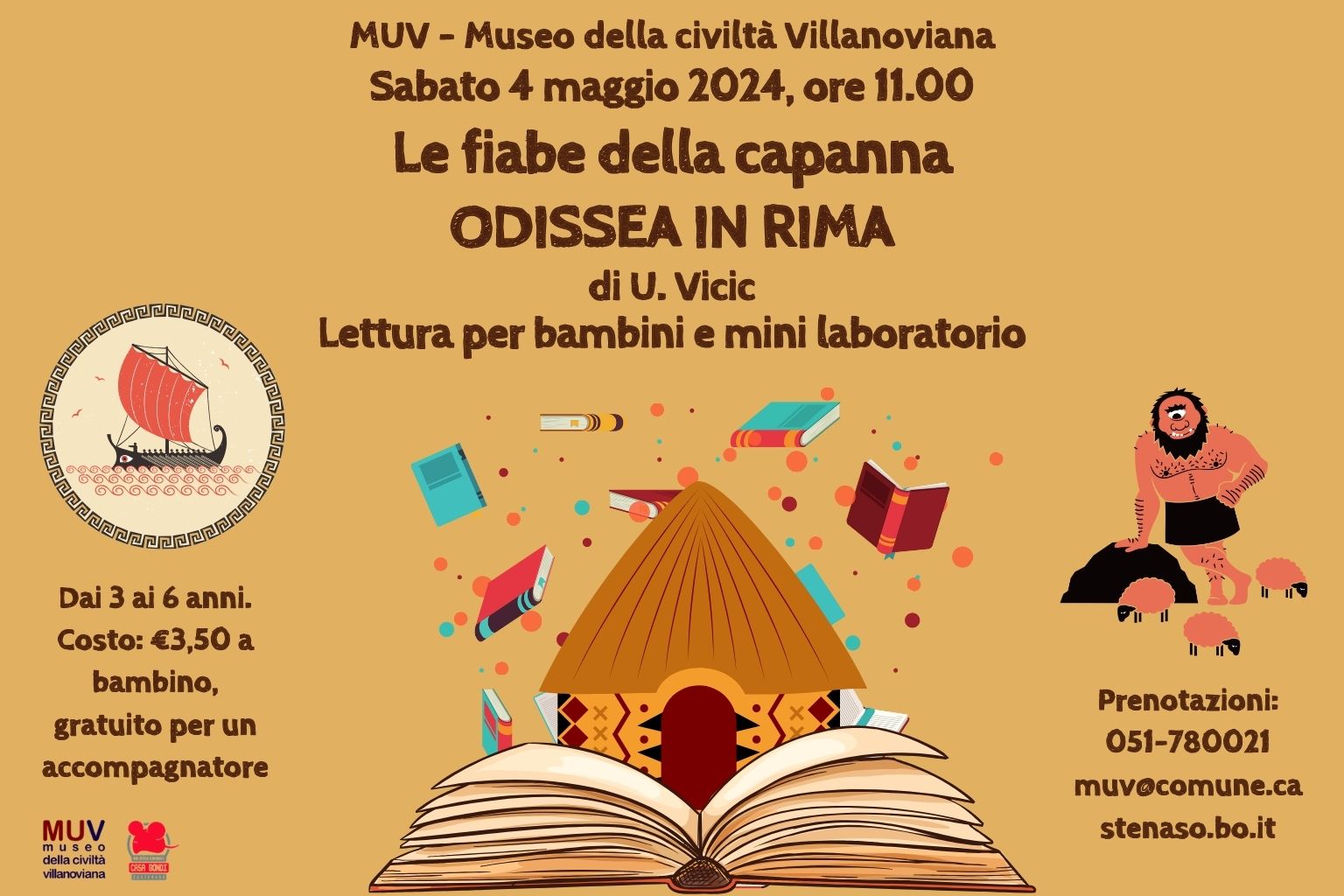 L’Odissea, chi non la conosce? Non ci si stanca mai di sentire le avventure di Ulisse per mare, ma questa volta il MUV ha in programma di raccontare quest’opera famosissima con una nota un po’...in rima. Vi aspettiamo per l’ultimo mitico appuntamento con le Fiabe della Capanna sabato 4 maggio alle ore 11.00. Come sempre per tutti i bimbi dai 3 ai 6 anni nella suggestiva cornice della esposizione “Balocchi al Museo”, circondati dai giocattoli della collezione Pasqualini-Zanella.