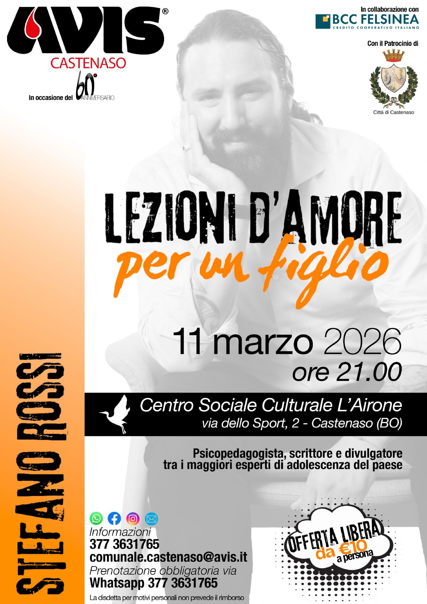 In occasione del 60° anniversario di AVIS Castenaso, una serata di riflessione e confronto con Stefano Rossi, psicopedagogista, scrittore e divulgatore, tra i maggiori esperti italiani di adolescenza.