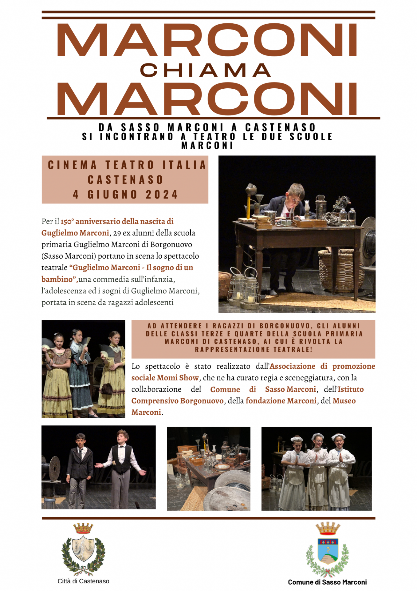 Per il 150° anniversario della nascita di Guglielmo Marconi (25 aprile 1924), il 4 giugno al Cinema Teatro Italia di Castenaso, 29 ex alunni della scuola primaria Guglielmo Marconi di Borgonuovo (Sasso Marconi) portano in scena lo spettacolo teatrale “Guglielmo Marconi - Il sogno di un bambino”, una commedia sull’infanzia, l’adolescenza ed i sogni di Guglielmo Marconi, portata in scena da ragazzi adolescenti. Uno spettacolo sulla vicenda umana, famigliare e scientifica dello scienziato bolognese, premio Nobel per la fisica così legato alla storia della cittadina di Sasso Marconi, dove passò la maggior parte della sua vita fino alla maggiore età e dove compì i suoi primi esperimenti di trasmissione elettromagnetica.