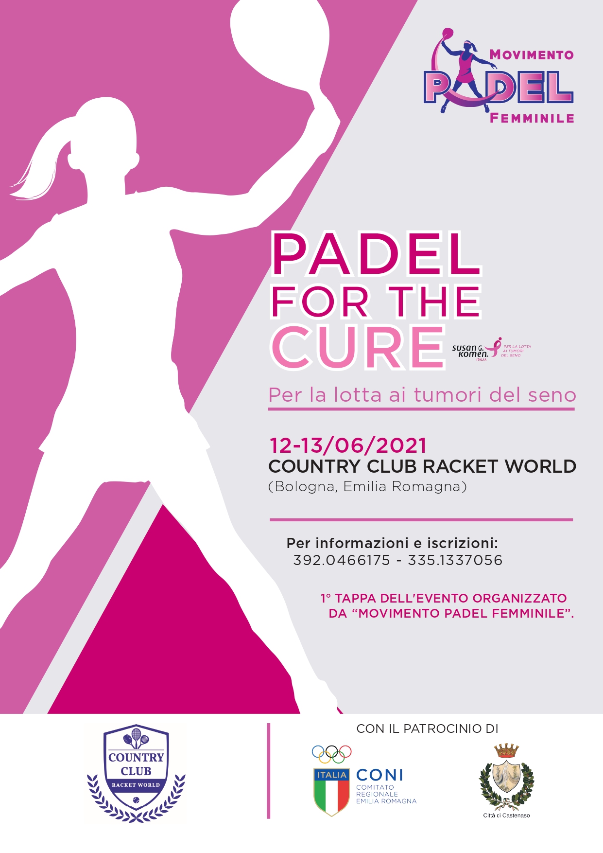 Il 12 e 13 giugno, presso il Country Club Racket World di Castenaso (BO), sarà organizzato un torneo a coppie e si giocherà all’esterno: seguirà un momento dedicato al benessere, con lezioni di yoga e pilates ma anche di trucco con i make up artists di Cosmoprof e altri professionisti di realtà bolognesi. Parte del ricavato del torneo sarà devoluto in favore dei progetti di Komen Italia a sostegno della salute delle donne.