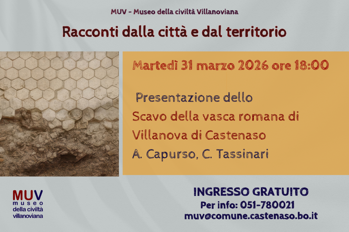 Martedì 31 marzo il MUV ospiterà il terzo e ultimo appuntamento della rassegna Racconti dalla città e dal territorio. Gli archeologi, Annalisa Capurso, della Soprintendenza Archeologia belle arti e paesaggio per la città metropolitana di Bologna e da Cristian Tassinari della ditta Tecne Srl, illustreranno un frammento di storia del territorio di Castenaso presentando lo scavo della vasca romana, portata in luce nel 2019 durante un intervento di archeologia preventiva, poi restaurata ed esposta in loco. Il rinvenimento fa parte di un più ampio complesso rustico destinato alla lavorazione e conservazione dei prodotti agricoli.