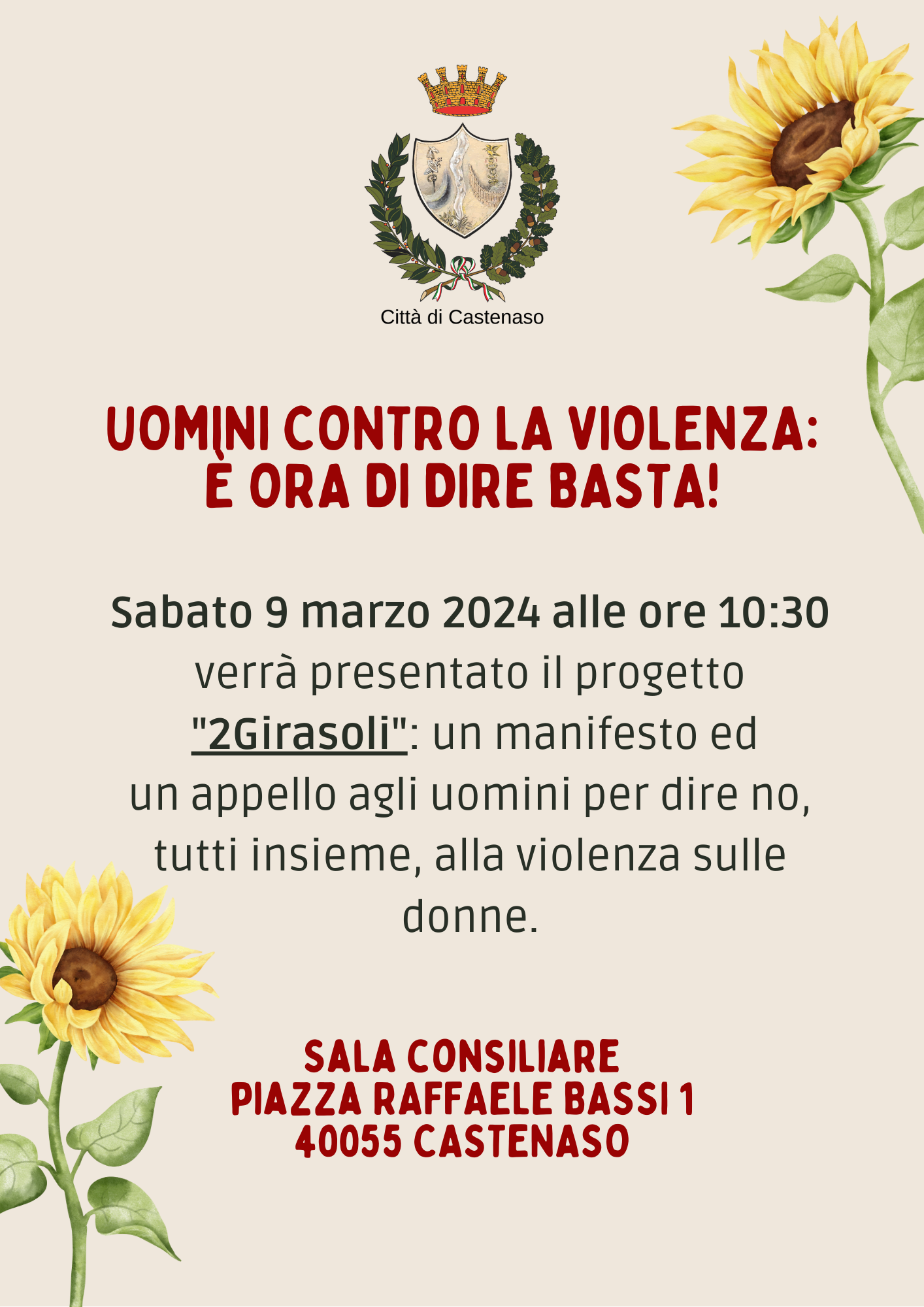 Sabato 9 marzo 2024 alle ore 10.30, presso la Sala Consiliare del Comune di Castenaso verrà presentato il progetto “2Girasoli”, un manifesto e un appello per dire un “NO” corale alla violenza sulle donne.