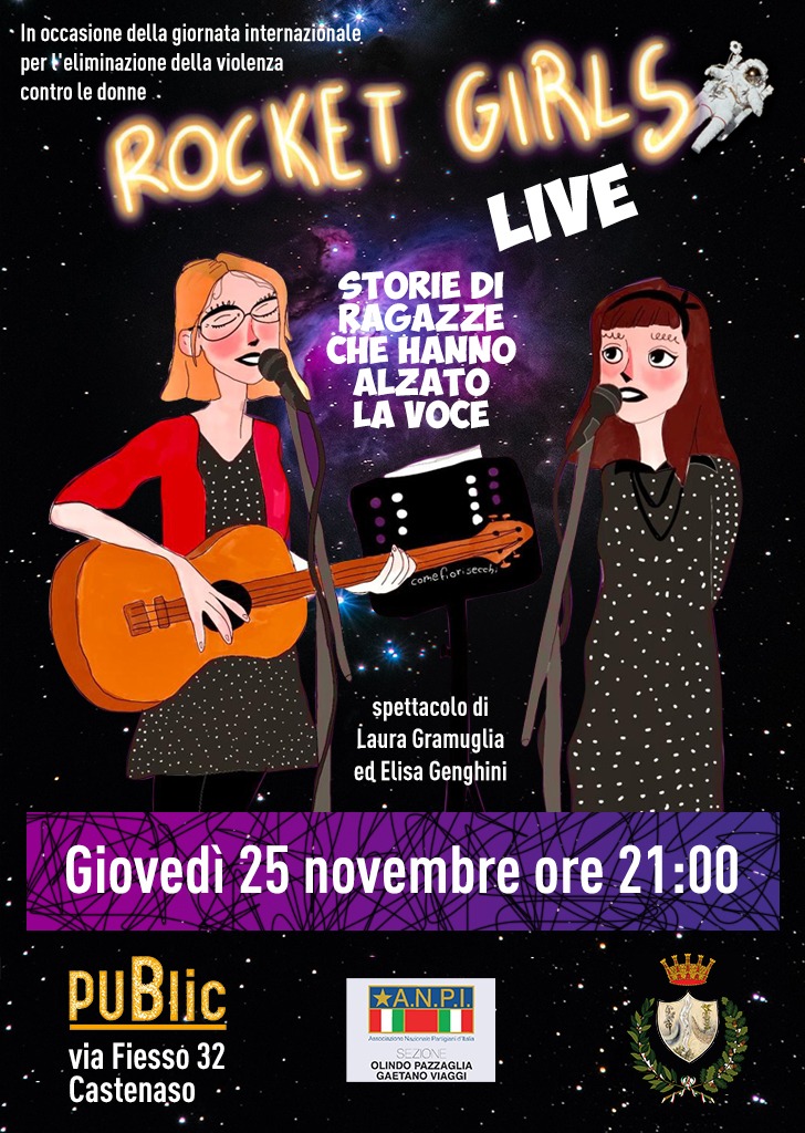 In occasione della Giornata internazionale per l'eliminazione della violenza contro le donne, spettacolo al PuBlic (via Fiesso, 32 Castenaso) giovedì 25 novembre 2021 alle ore 21:00: Rocket Girls Live: storie di ragazze che hanno alzato la voce. Di Laura Gramuglia ed Elisa Genghini.