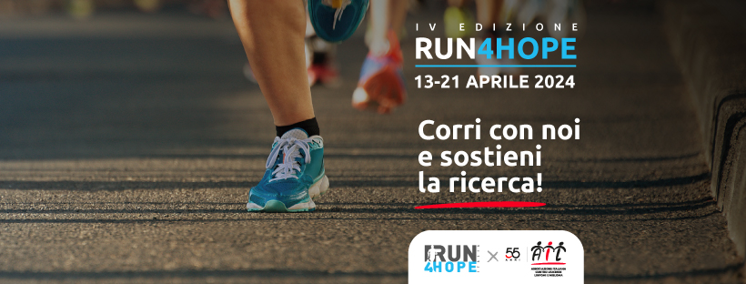 Run4Hope Italia Onlus organizza la quarta edizione della staffetta benefica che quest'anno compirà il Giro d'Italia dal 13 al 21 aprile 2024. I fondi raccolti durante le diverse tappe saranno destinati in favore di AIL - Associazione Italiana contro Leucemie - Linfomi e Mieloma.
