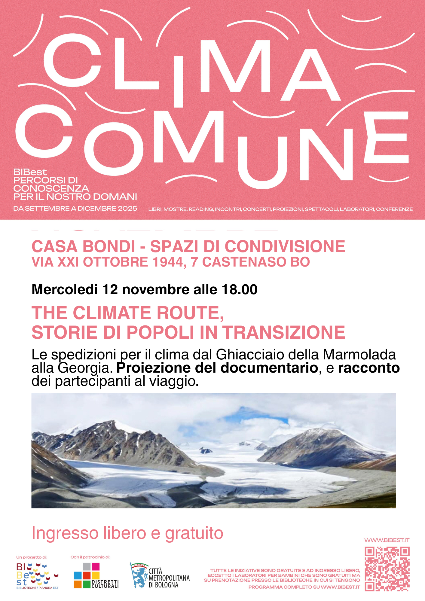 Mercoledì 12 novembre, alle ore 18.00, in programma a Casa Bondi, “The climate route”, un evento che porta a Castenaso il racconto in prima persona di chi vive il cambiamento climatico sulla propria pelle. Dalle Alpi al Caucaso, dalle memorie del Ghiacciaio della Marmolada alle comunità della Georgia, il progetto intreccia immagini, voci e passi di viaggio per mostrare come territori e persone stiano affrontando una trasformazione ormai quotidiana.