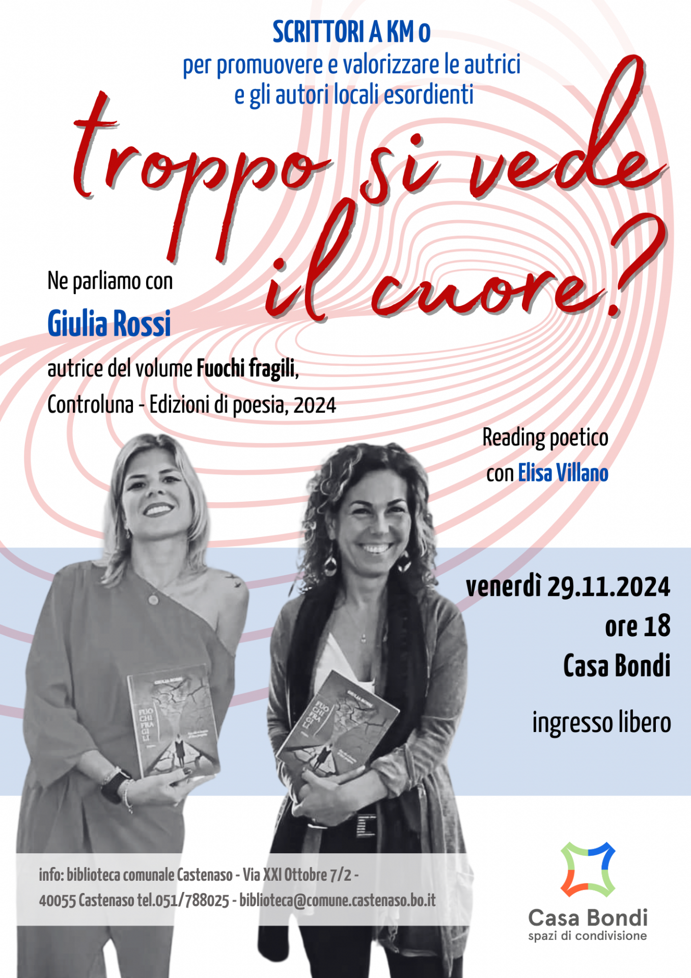 Venerdì 29 novembre alle 18 a Casa Bondi Giulia Rossi, giovane autrice e insegnante presso la scuola media Gozzadini di Castenaso, parlerà del suo libro di poesie Fuochi fragili, Contro Luna edizioni di poesia, 2024. Ad accompagnarla, reading poetico con Elisa Villano.