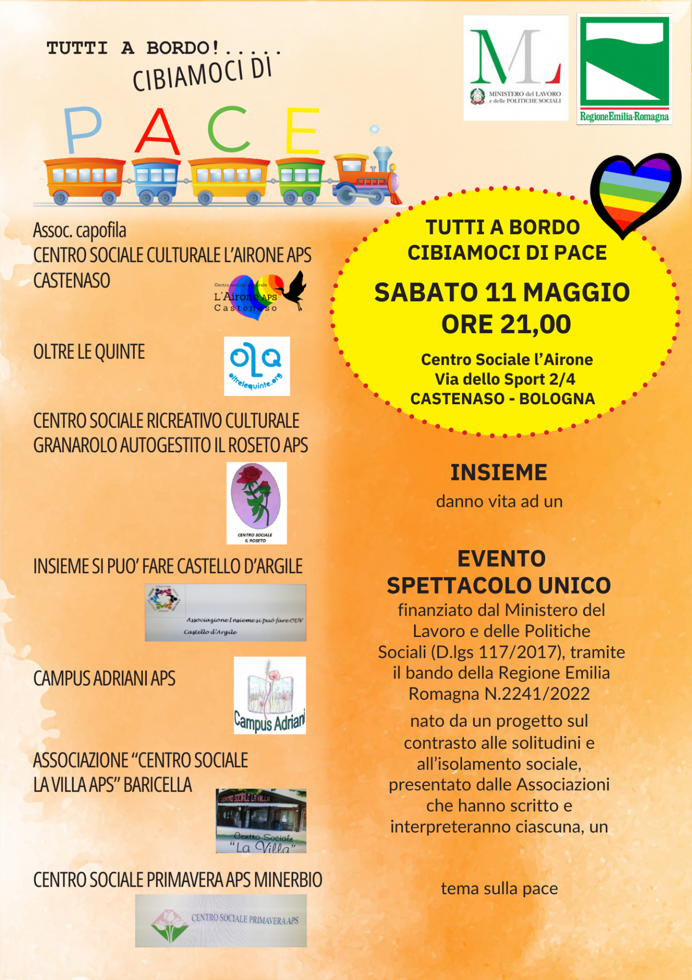 Il Centro sociale culturale L'Airone APS Castenaso come associazionee capofila insieme a Oltre le quinte, Centro sociale ricreativo culturale Granarolo autogestito il Roseto APS, Insieme si può fare Castello d'Argile, Campus Adriani APS, Associazione "Centro sociale La Villa APS" Baricella, Centro sociale primavera APS Minerbio danno vita ad un EVENTO SPETTACOLO UNICO finanziato dal Ministero del Lavoro e delle Politiche Sociali (D.lgs 117/2017), tramite il bando della Regione Emilia Romagna N.2241/2022 nato da un progetto sul contrasto alle solitudini e all’isolamento sociale, presentato dalle Associazioni che hanno scritto e interpreteranno ciascuna, un tema sulla pace